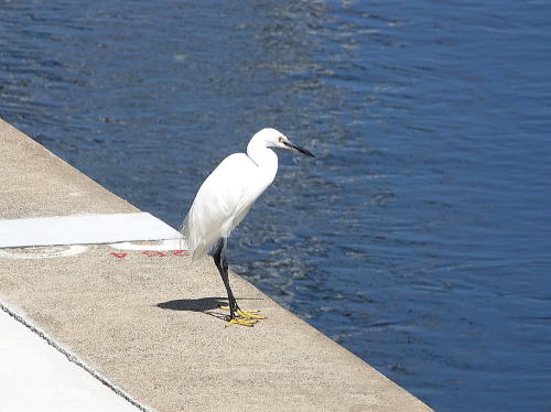 | イソシギ[9月25日] 珍しくツルツルに刈られた河原で採餌していました。 | コサギ[9月25日] 工事のほぼ終わった堤防に佇んでいます。 | |