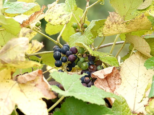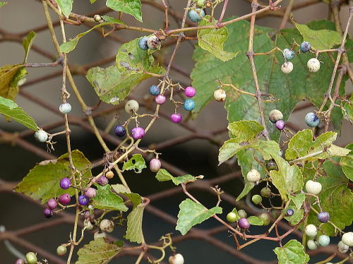 | キセキレイ[10月9日] 互いにけん制しているようでこの距離以上は近付きません。 | ノブドウ[10月9日] いつの間にか綺麗に色づいてきました。 | |