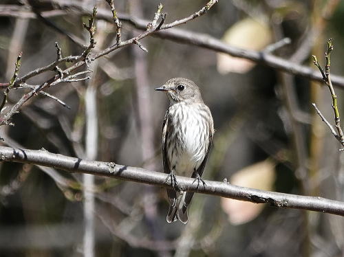 | コサメビタキ[10月11日] 混みあった枝の中に1羽居ました。 | コサメビタキ[10月11日] 虫を獲るためでしょうか見易い所に出て来ました。 | |