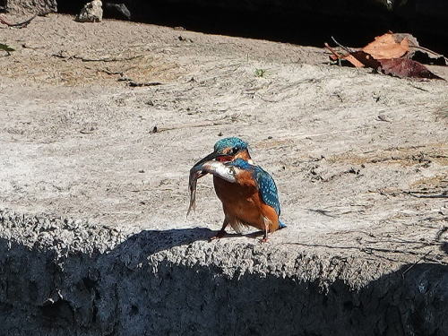 | カワセミ[10月2日] 大漁です。あっという間に飲み込みました。 | モズ[10月2日] 小さな声で何やらぐじゅぐじゅ言っています。 | |