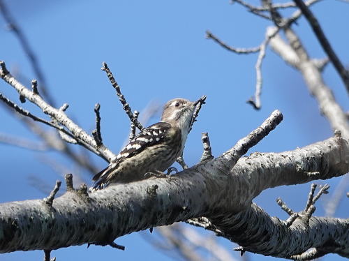 | コゲラ[10月1日] 大きな音を立てて突いていました。 | エナガ[10月1日] 大きな群れで動いていました。こんもりと茂った所でした。 |