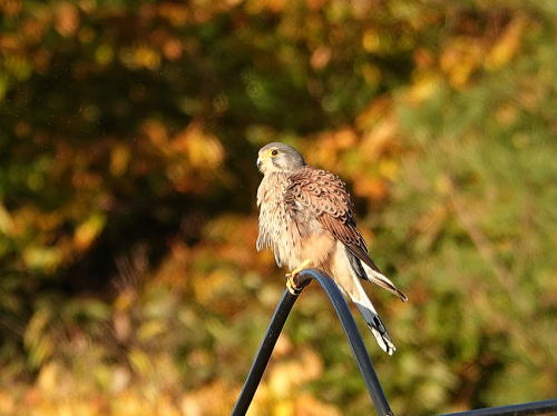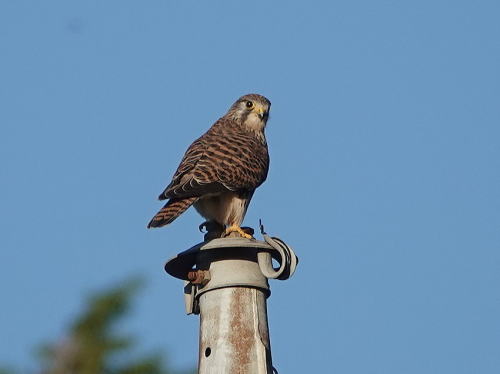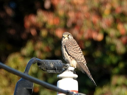 | カワセミ[11月27日] 声は聞こえるのですが、姿が見えません。やっと見つけました。 | チョウゲンボウ[11月21日] ♀が電柱の上にいました。 | |