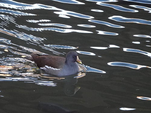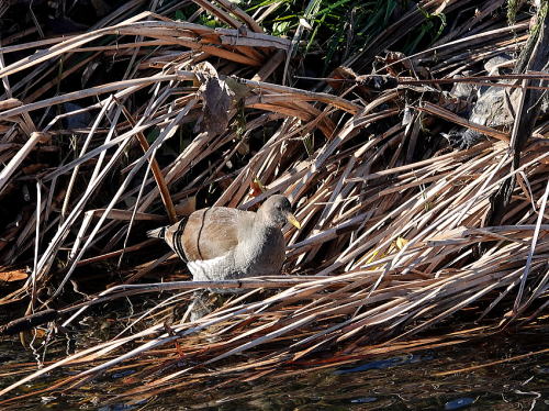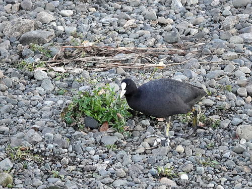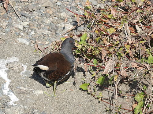 | ヒドリガモ[12月14日] 水草が無いので、河原の菜っ葉を食べています。 | バン[12月14日] 河原に向かっています。菜っ葉を食べに来たのでしょう。 | |