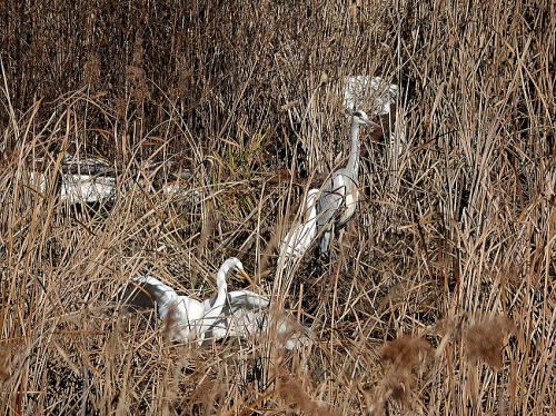 | ダイサギ、コサギ、アオサギ[12月28日] 枯れたガマの中に揃っていました。 | ダイサギ[12月28日] 水溜りの方に飛んで来ました。 | |