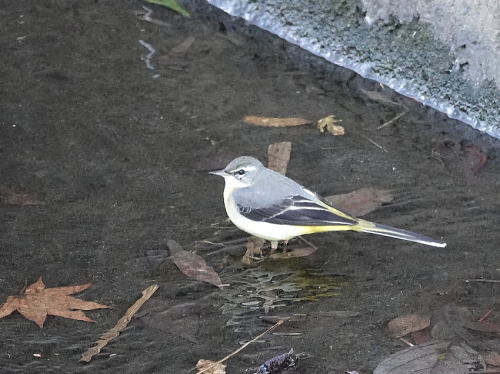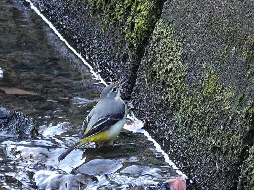| バン[12月7日] 繁みから出て草を食べに来ました。 | キセキレイ[12月7日] 護岸に登ろうとしています。 | |