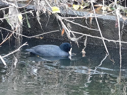 | カワセミ[12月4日] お嬢さんです。 | バン[12月4日] 1羽だけ、柔らかそうな葉を食べていました。 | |