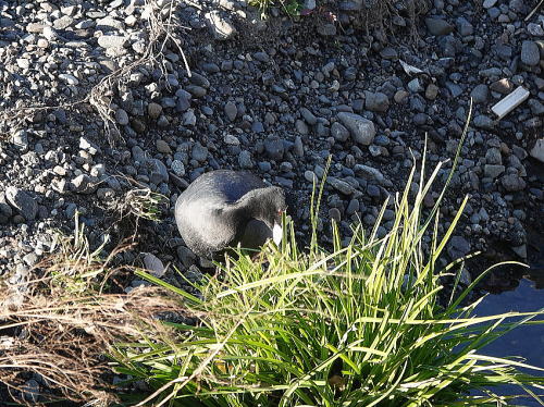 | コガモ[12月4日] 今日は本流に3羽いました。 | マガモ[12月4日] ♂は河原で爆睡中です。 | |