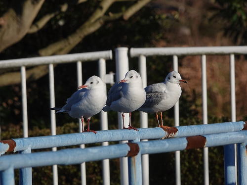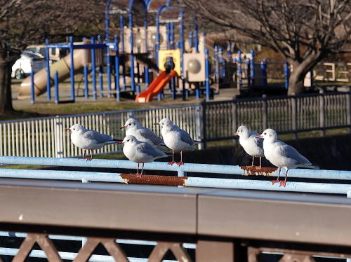 | ユリカモメ[12月19日] 今日は先日より下流の橋にも来ていました。 | ユリカモメ[12月19日] 20羽並びくらいになるのを期待しています。 | |