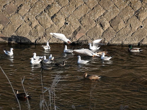 | ユリカモメ、オオバン、マガモ、カルガモ[12月26日] 蒔かれた餌を目掛けて集まって来ます。 | ユリカモメ[12月26日] 無関心なのも居ます。 | |