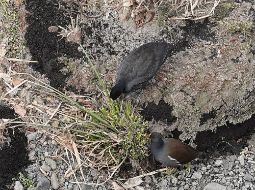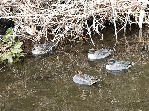 | コガモ[2月1日] 求愛活動中かな。 | オオバン、バン[2月1日] 仲良く食事中です。 |