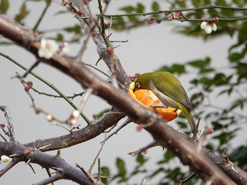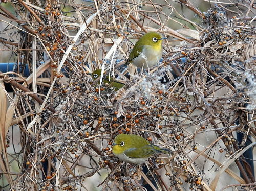 | ヒヨドリ[2月16日] 大食漢です。 | メジロ[2月16日] 群れでやって来てしばらく様子を見た後食べ始めました。 | |