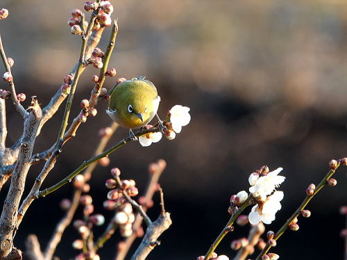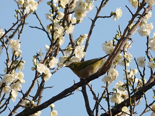 | ジョウビタキ[2月16日] 梅がほころび始めました。 | メジロ[2月16日] 白梅はほぼ満開でした。 | |