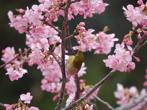 | カワヅザクラ[2月24日] もうすぐ満開です。 | メジロ[2月24日] カワヅザクラに何羽もが来て蜜を吸っています。 | |