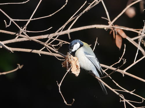 | メジロ[2月4日] この2羽はいつも一緒のようです。 | シジュウカラ[2月4日] 虫の卵か蛹でしょうか、糸状のものを引っ張り出して食べていました。 | |