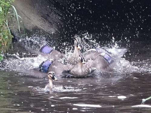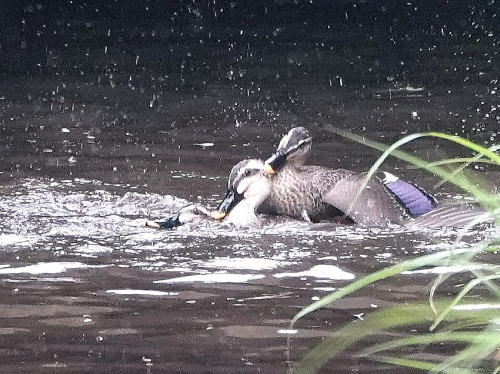 | カルガモT[4月22日] 求愛中の2羽の所に邪魔が入りました。 | カルガモU[4月22日] 喧嘩が始まりました。 | |