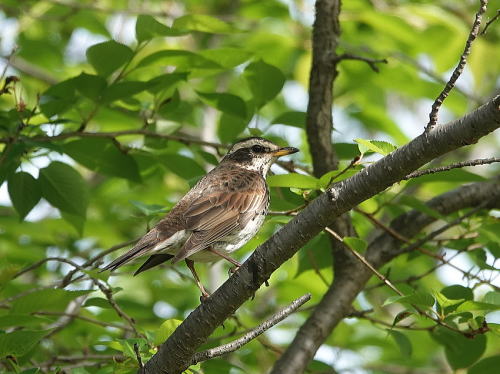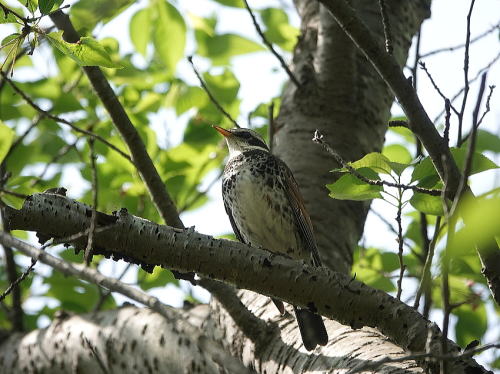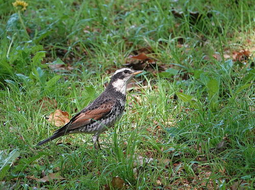 | シメ[4月20日] 今日も1羽だけ、青虫を獲っていました。 | ツグミ[4月20日] 芝生で10羽位が採餌中、人が近づくと一斉に木の枝に飛び移ります。 | |