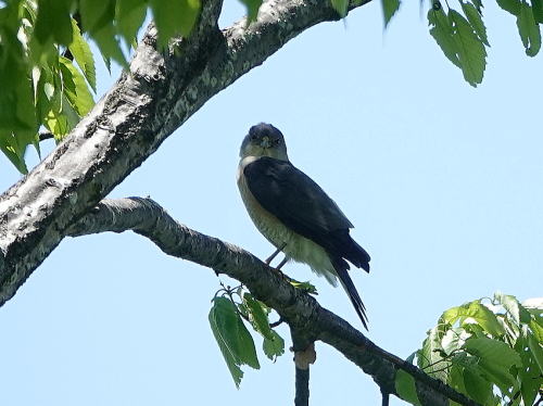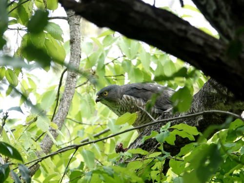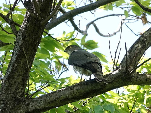 | ツミ♀[4月16日] キーキー鳴いて飛んで来ました。 | ツミ♂[4月16日] カラスに絡まれているようでした。 | |