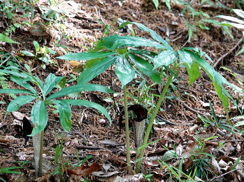 | シロハラ[4月10日] こちらも立ち寄りでしょう。 | マムシグサ[4月9日] 茎の模様からマムシグサと思いました。 | |