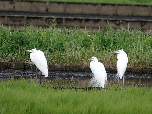 | チュウサギ[5月12日] ばらばらに3羽いました。 | ダイサギ[5月12日] こちらは3羽で一緒に行動していました。 | |