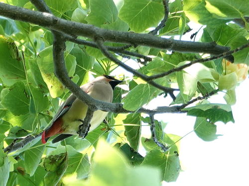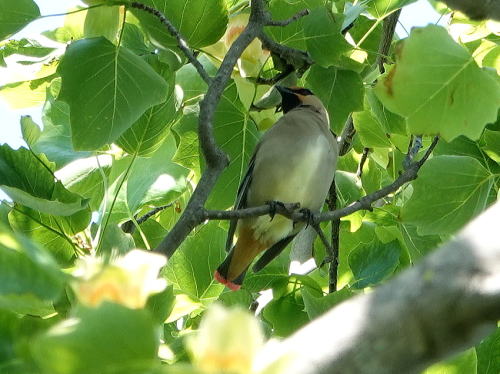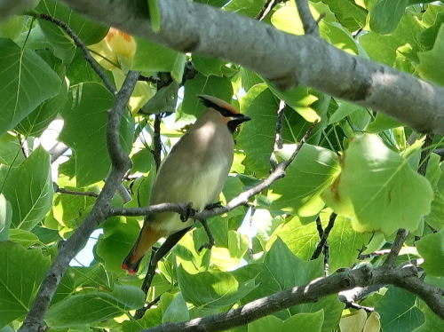 | ヒレンジャク[5月10日] 未だいるよと教えて頂きました。 | ヒレンジャク[5月10日] 高い木の天辺辺りに止まっているので見上げます。 | |