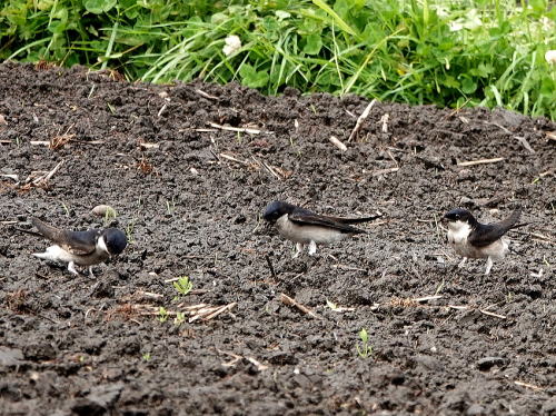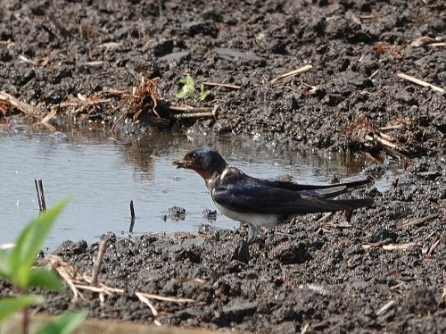| ツバメ[5月11日] 水の入り始めた田んぼに巣材を取りに来ていました。 | イワツバメ[5月12日] 同じ田んぼに数羽で来て巣材を取って行きました。 | |
