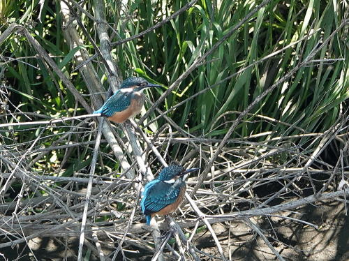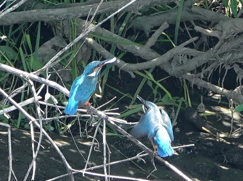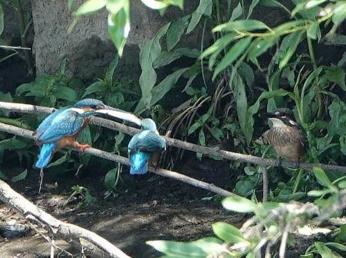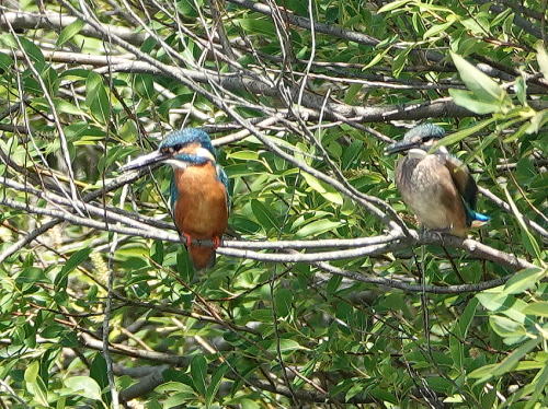 | カワセミ[5月10日] 親と幼鳥です。 | カワセミ[5月10日] 親(左)が獲物を持ってきました。 | |