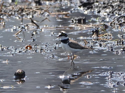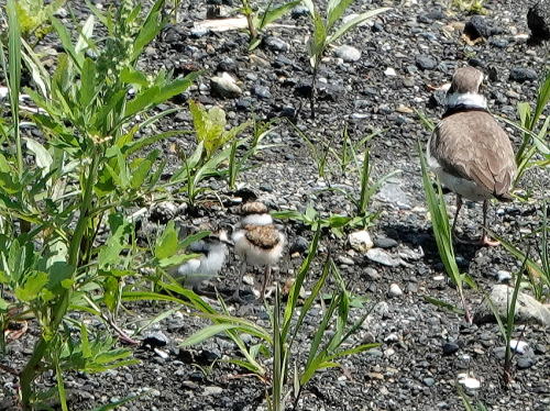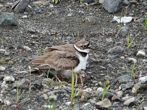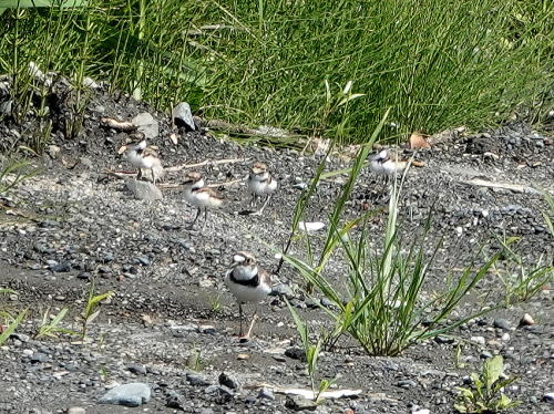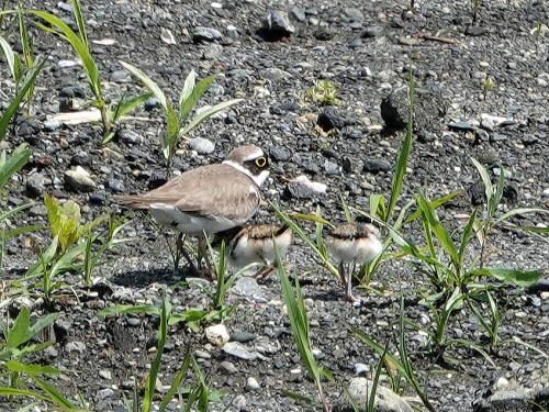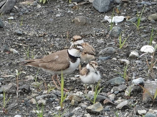| コチドリ[5月17日] 昨夕に4羽孵ったと教えて頂きました。親の後ろに4羽います。 | コチドリ[5月17日] 遠くて小さいので探すのが大変です。 | |