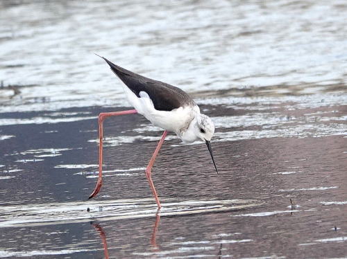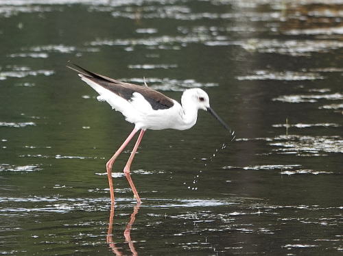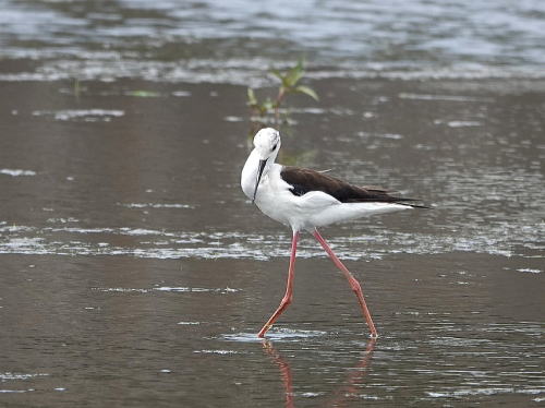 | セイタカシギ[5月25日] 日没前で暗かったですが、何とか見つけられました。 | セイタカシギ[5月25日] 田んぼの中を歩いて採餌していました。 | |