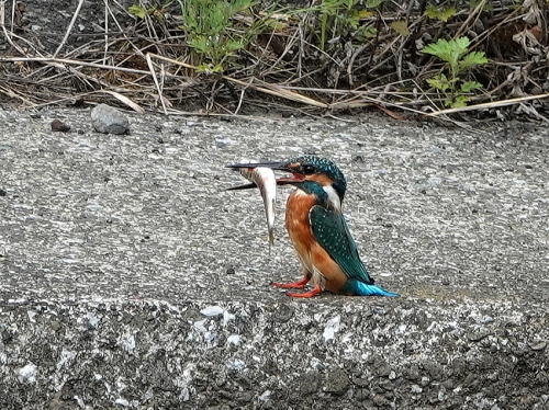 | メジロ[8月30日] メジロだけでした。 | カワセミ[8月28日] 獲物が大き過ぎて飲み込むのに難渋していました。 | |