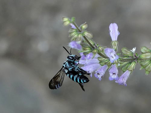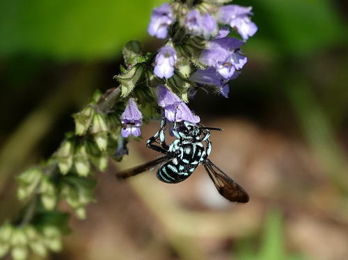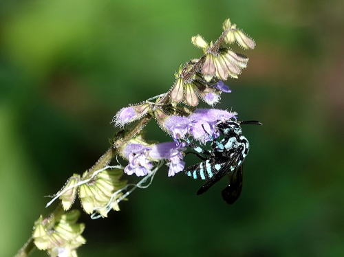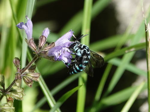 | ルリモンハナバチ[8月19日] アキノタムラソウで吸蜜中でした。。 | ルリモンハナバチ[8月19日] 忙しなく次から次の花へと移って行きます。 | |