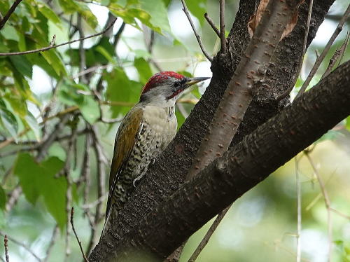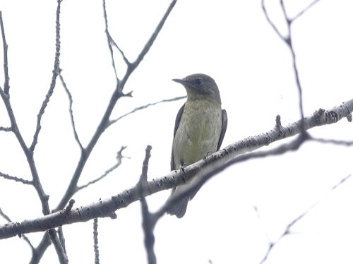 | アオゲラ[9月26日] 飛んで来て止まったのはアオゲラでした。鳴かないので気が付きません。 | エゾビタキ[9月25日] 居たよと教えて頂きました。シジュウカラの群れに居ました。 | |