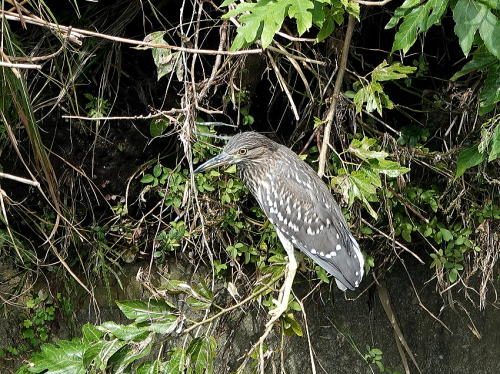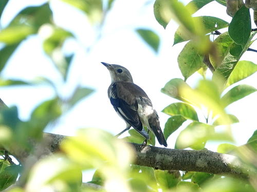 | ササゴイ[9月13日] 小魚を獲ってるのかな。 | コムクドリ[9月13日] 木陰で休憩中のようです。若♂でしょうか、1羽だけ見かけました。 | |