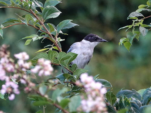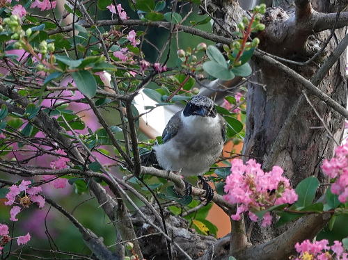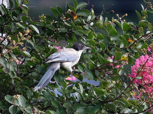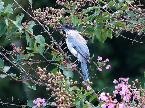 | オナガ[9月10日] 朝早いうちは街路樹のサルスベリに群れています。 | オナガ[9月10日] 胡麻塩頭なので若鳥でしょう。 | |