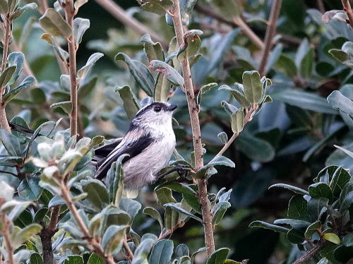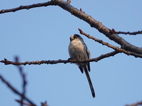 | エナガ[10月27日] 枝を這う虫(アリ?)を獲って食べていました。 | エナガ[10月27日] 充分食べたのか、隣の木に止まり羽繕いをしていました。 | |