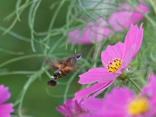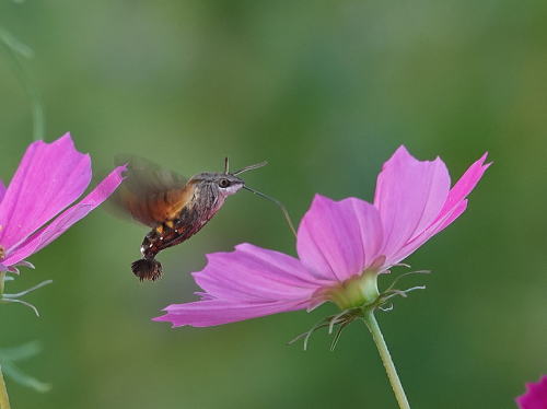 | ホシホウジャク[10月12日] コスモスが沢山咲いてきました。 | ホシホウジャク[10月12日] 長い管を伸ばして蜜を吸っているのでしょう。 | |