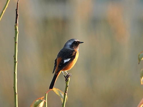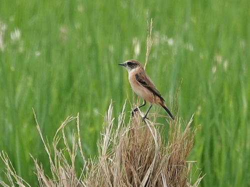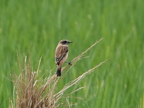 | カワセミ[10月31日] 辺りを警戒していました。 | ノビタキ[10月29日] 田んぼの枯れ草に止まっていました。ノビタキのようです。 | |