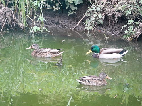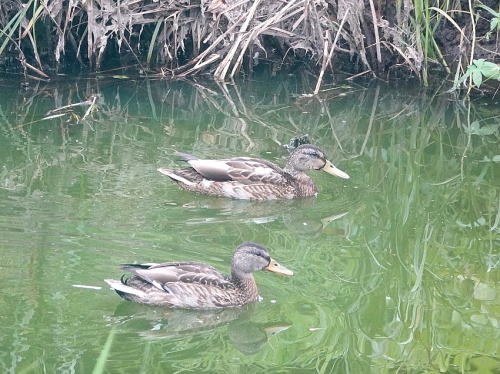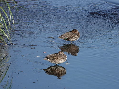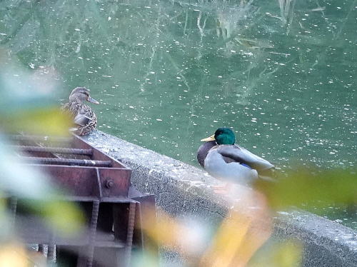| クイナ[10月28日] 水の中から何やら黒いものを見つけ、咥えてサササッとヨシの中へ入って行きました。 | マガモ♀、♂[10月27日] 番で来てくれました。 | |