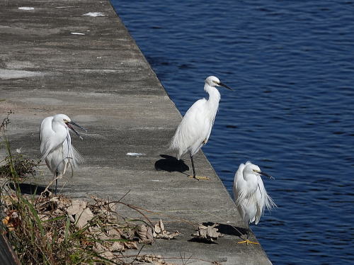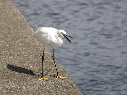 | ヒドリガモ[10月1日] シーズン中居てくれるといいのですが。 | コサギ[10月1日] 急に口を開け叫んでいました、何でしょうか。 |