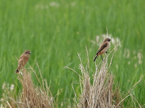 | ノビタキ[10月10日] 左♀、右♂でしょうか。 | ノビタキ[10月10日] しばらく居て欲しいですね。 | |
