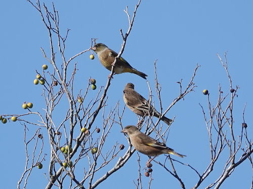 | バン[11月28日] 川に1羽だけいました。 | カワラヒワ[11月28日] 強風に揺られていました。下2羽は♀でしょうか。 | |