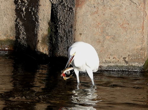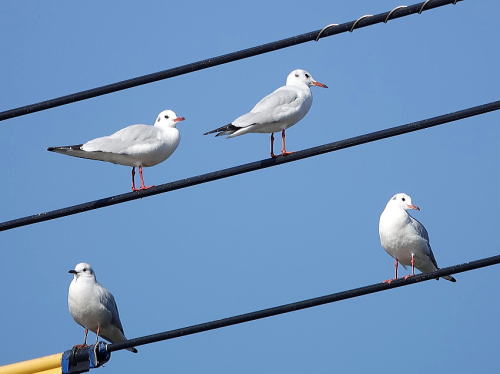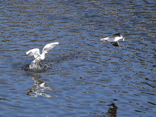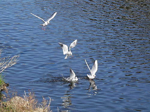 | ユリカモメ[11月28日] 20羽位の群れがやって来て川の上を飛び回りました。 | ユリカモメ[11月28日] 漁をしに来たようです。獲物を獲りました。 | |
