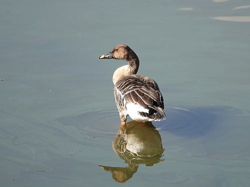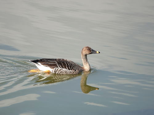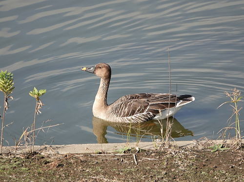 | オオヒシクイ[11月21日] 北の遊水地に一週間ほど前から来ています。 | オオヒシクイ[11月21日] 浅い所で水草をとって食べていました。満腹したのか泳ぎだしました。 | |