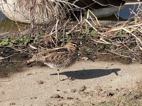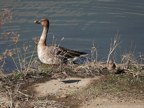 | オオヒシクイ[11月21日] この辺りが休憩場所のようです。 | オオヒシクイ、タシギ[11月21日] すぐ横でタシギが休憩中です。 | |