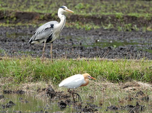 | アマサギ[5月14日] 右に左にと歩き回り採餌しています。 | アオサギ、アマサギ[5月14日] 近くにアオサギが2羽居ましたが気にしません。 | |