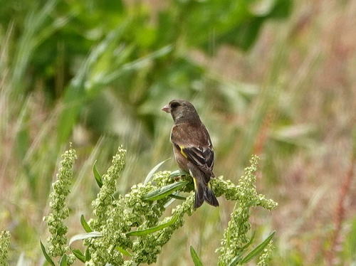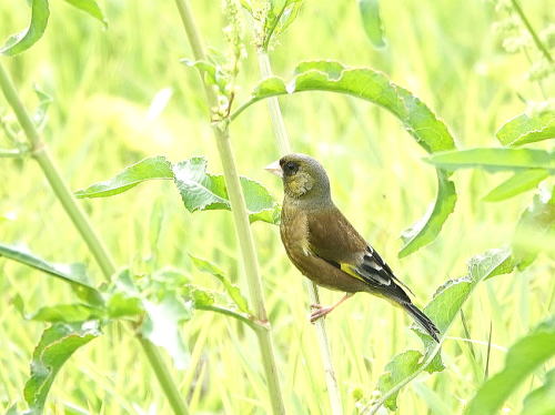 | アマサギ[5月14日] 採餌に夢中です。 | カワラヒワ[5月12日] 1羽だけ低い草に止まっていました。 | |