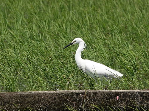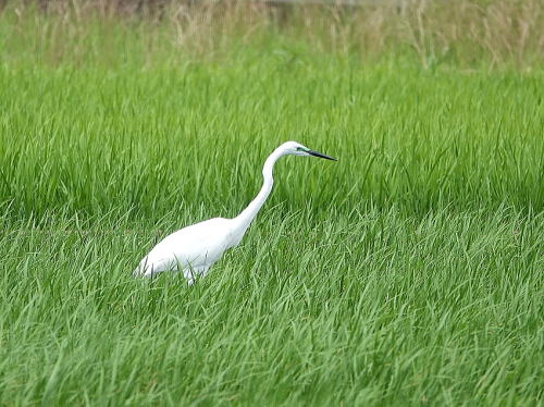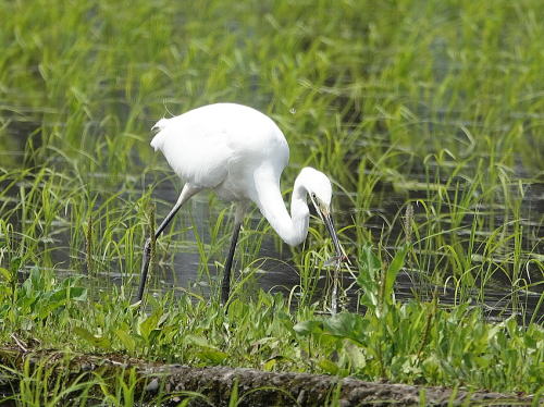 | カルガモ[6月25日] ヒナ1羽連れです。4羽連れは見かけませんでした。 | ダイサギ[6月25日] 夏羽です。餌を探して歩き回っていました。 | |