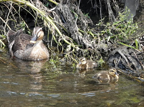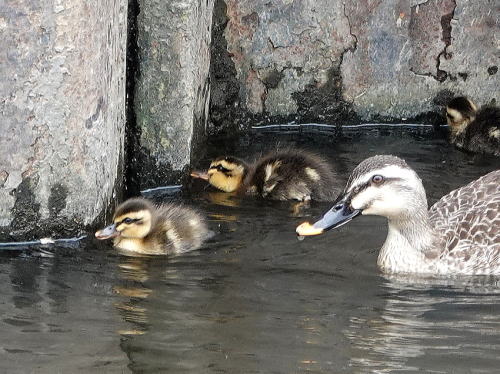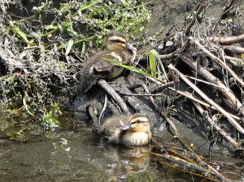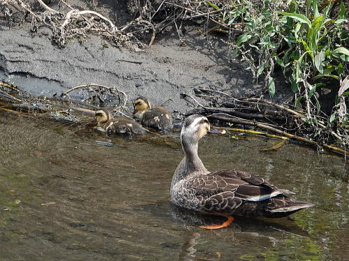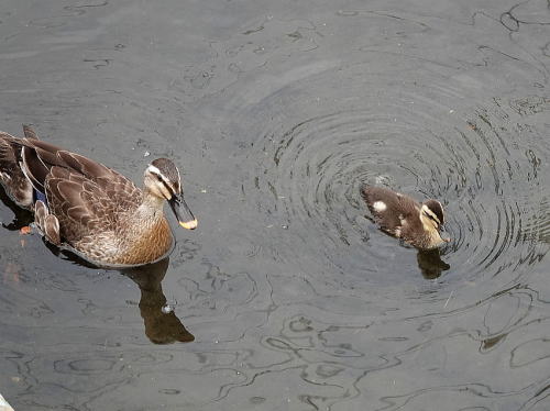 | カルガモ[6月9日] ヒナ連れのカルガモがいました。 | カルガモ[6月9日] ヒナは食事に夢中です。 | |