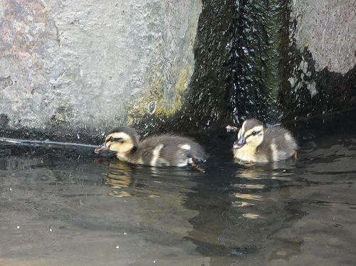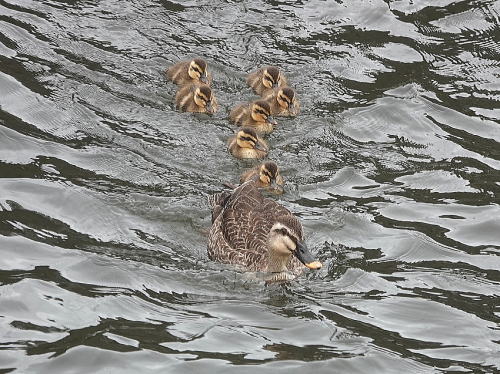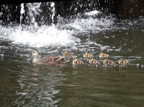 | カルガモ[6月9日] 滝の前を通るときに集合しました。 | カルガモ[6月9日] ヒナは7羽です。 | |