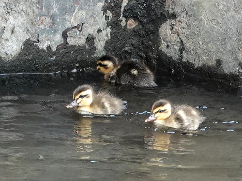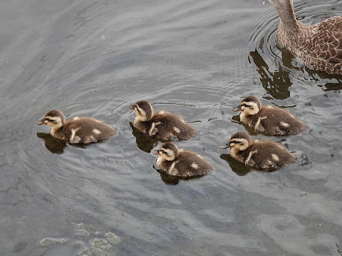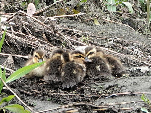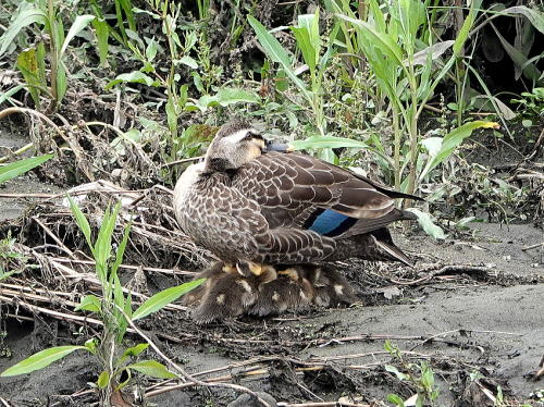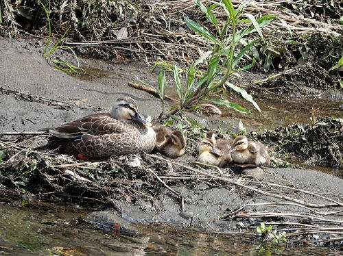 | カルガモ[6月10日] 最初、ヒナは5羽しか見かけませんでした。 | カルガモ[6月10日] お母さんのおなかの下に潜り込んでお昼寝です。見たことがないような気がします。 | |