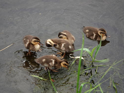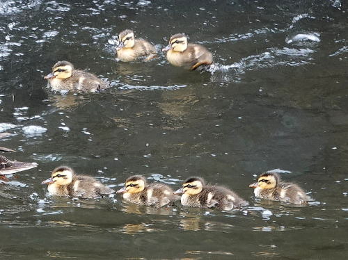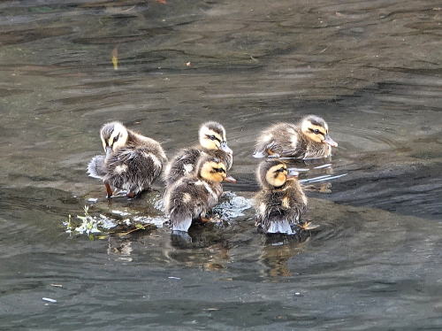 | カルガモ[6月10日] お母さんは食事に飛んで行ってしまいました。いつの間にか6羽になりました。 | カルガモ[6月10日] お母さんが帰って来ました。 | |
